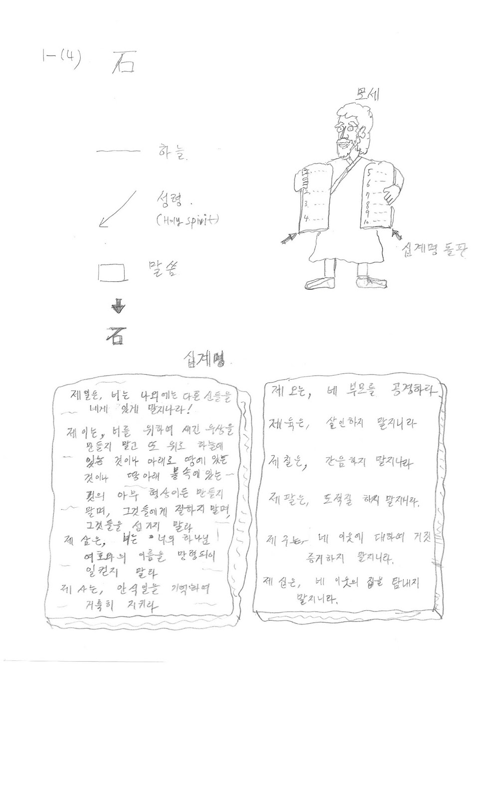 In the author Yang's semiotic interpretation, the stone, 石 can be analyzed into 3 components; (‘一’; sky, heaven, God + ‘丿’; Holy spirit +‘口’; God’s Word)
